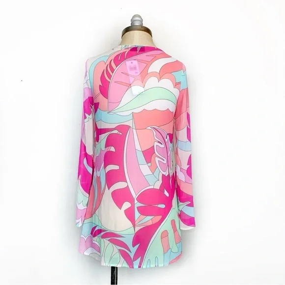 Make a splash on your next beach day or tropical getaway with this Catalina Beach Cover-Up, the ultimate blend of style and practicality! Designed with a flattering lace-up neckline and convenient side pockets, this cover-up is both chic and functional. The vibrant abstract pink and multi-colored leaf print adds a fun, tropical vibe that's perfect for lounging by the pool, strolling along the shore, or sipping cocktails at a beachside café.Lightweight and breezy, this versatile cover-up transitions effortlessly from beachwear to casual wear—throw it over your swimsuit during the day or pair it with sandals for a relaxed vacation look. Whether you're packing for a weekend escape or an extended vacation, this piece is an absolute essential for staying stylish and comfortable under the sun.New with tagsSoft and breathable for all-day comfortUpgrade your vacation wardrobe with this stunning Catalina cover-up—your beach days will never be the same! 🌴☀️Can ship same day or next day