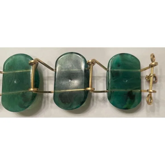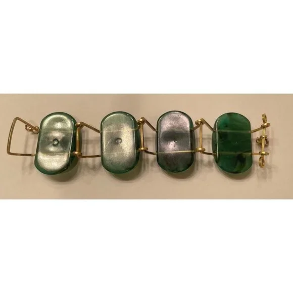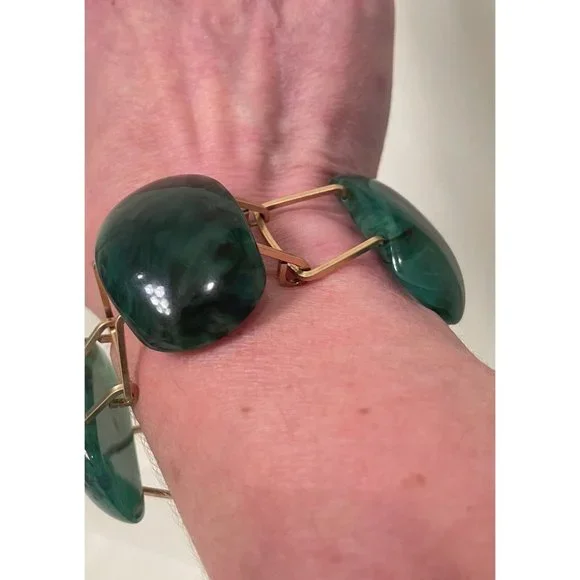 Unique Vintage Modernist Faux Jade Lucite Cabochon Goldtone Metal Link BraceletApproximate Measurements:Length: 7" - end to end including hook & clasp(Slightly longer when links straighten on arm)Each green panel: 1 1/2" long x 7/8" wideCondition:Very good condition. One of a kind statement piece. Clasps move around my wrist because it's too large, may lay still if it fit properly. Has not been cleaned or polished. See ALL pictures.*****Color may vary due to lighting.*****Authenticity is guaranteed!