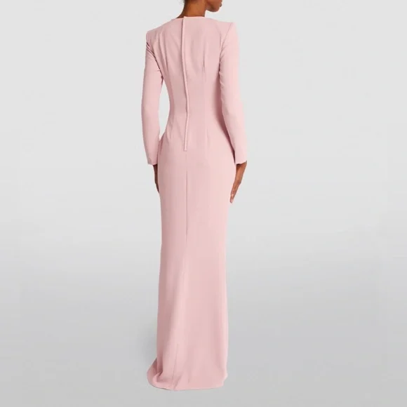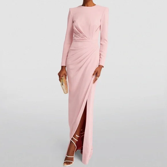 ZUHAIR MURAD Cady Draped Long Sleeved Maxi Dress Feel the tension in this gathered silhouette.Manipulating fabric and creating artful draping is one of the hardest crafts to master, and Zuhair Murad does it with ease with this gathered gown. Strong shoulder pads create a statement silhouette, with the material being gathered along one side, leading to a leg split for ease of movement.Length: 168cm / Bust: 80cm / Waist: 70cm approx. based on a size FR 38• Made in LebanonComposition100% PolyesterLining: 100% SilkBrand new, tags attached.Size 38 Available Zuhair Murad Designer Fits True to sizeColor - Pink